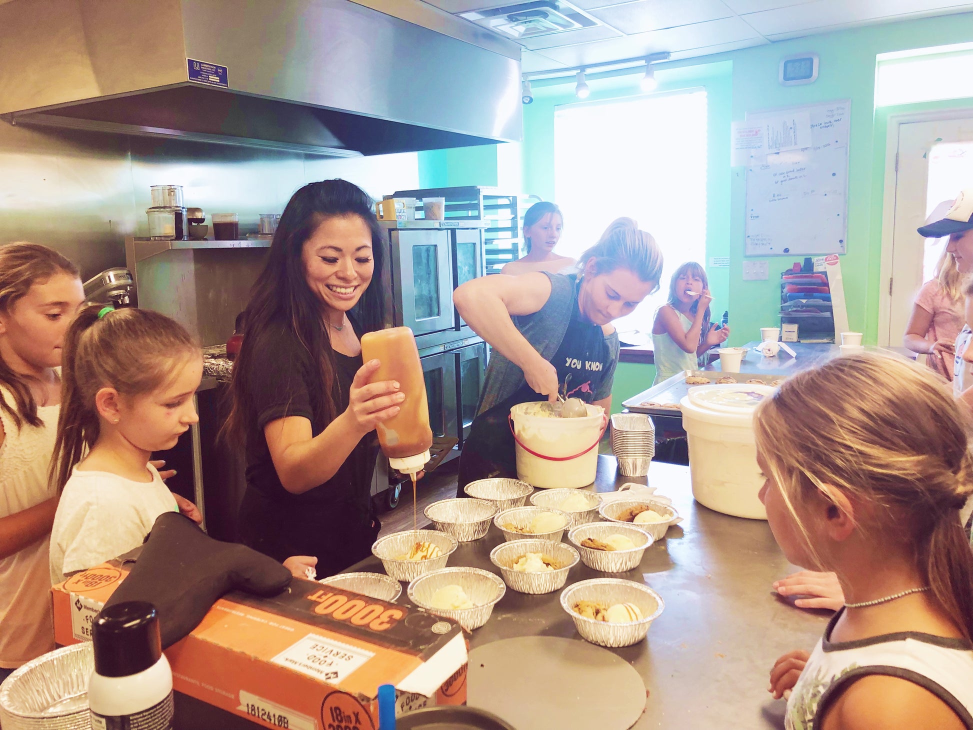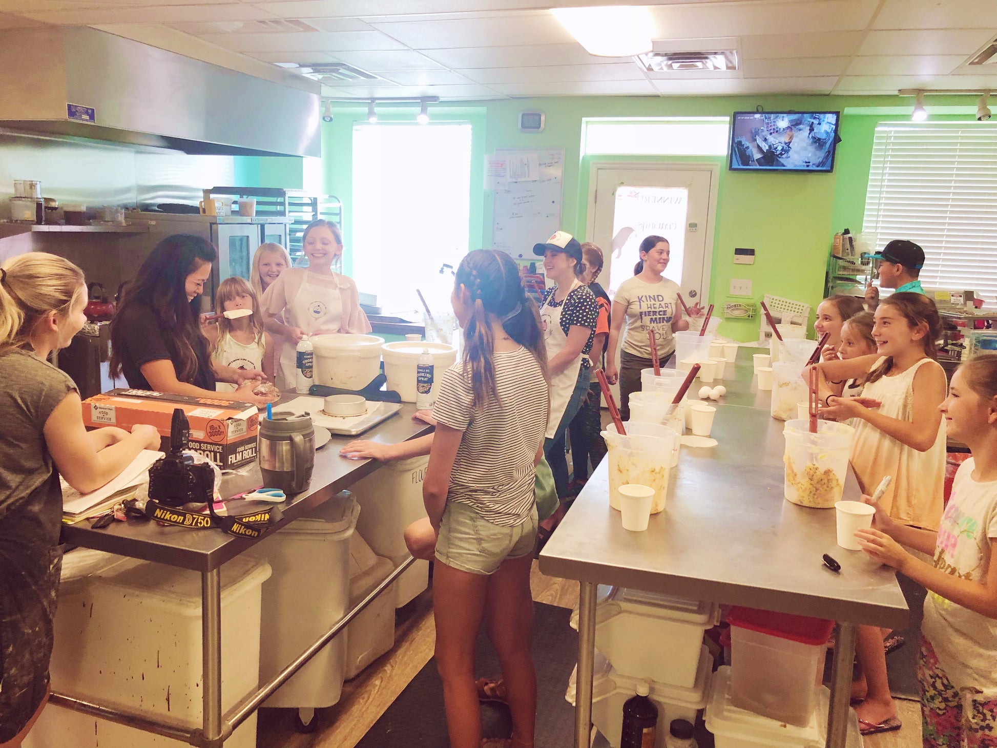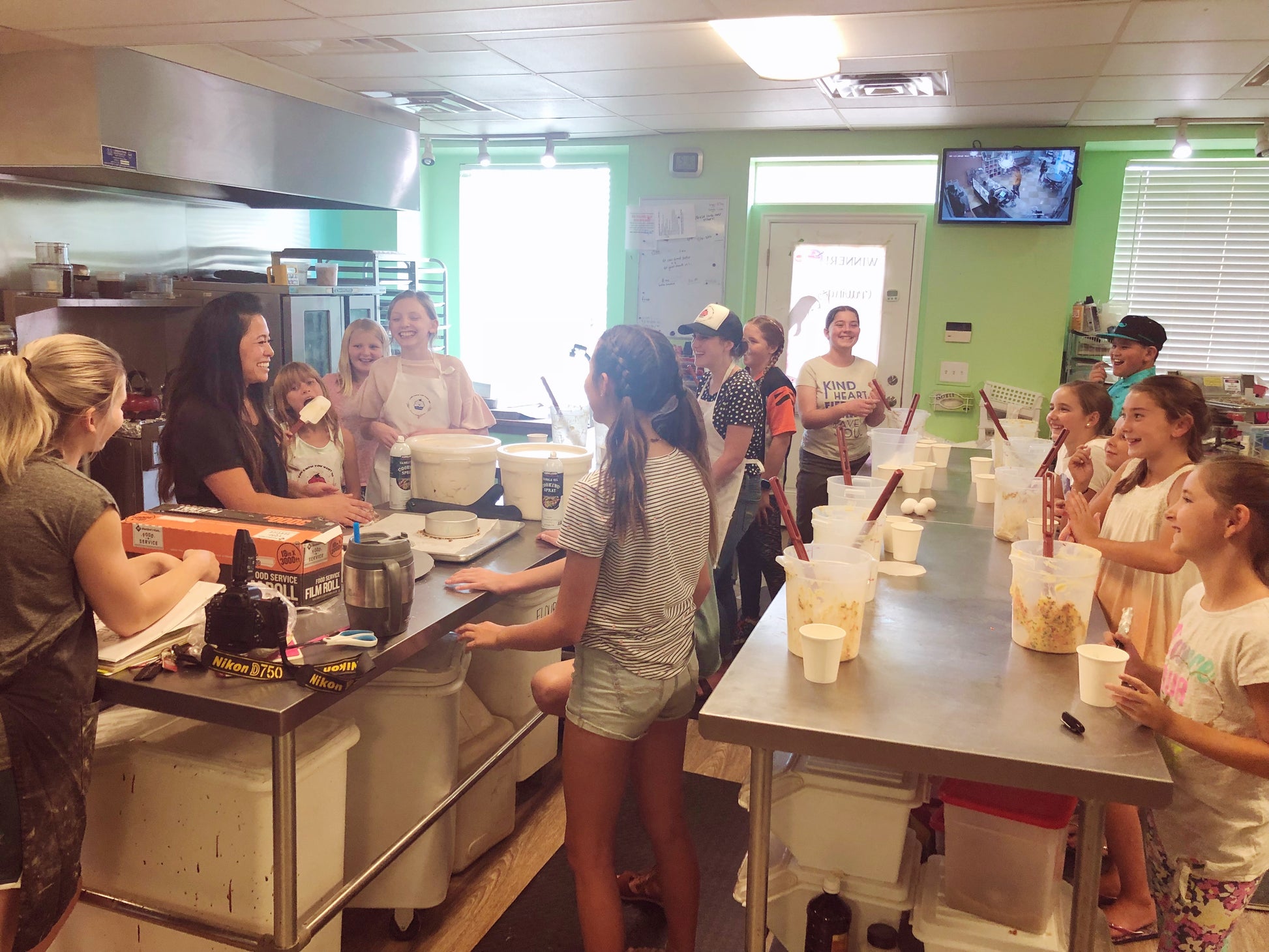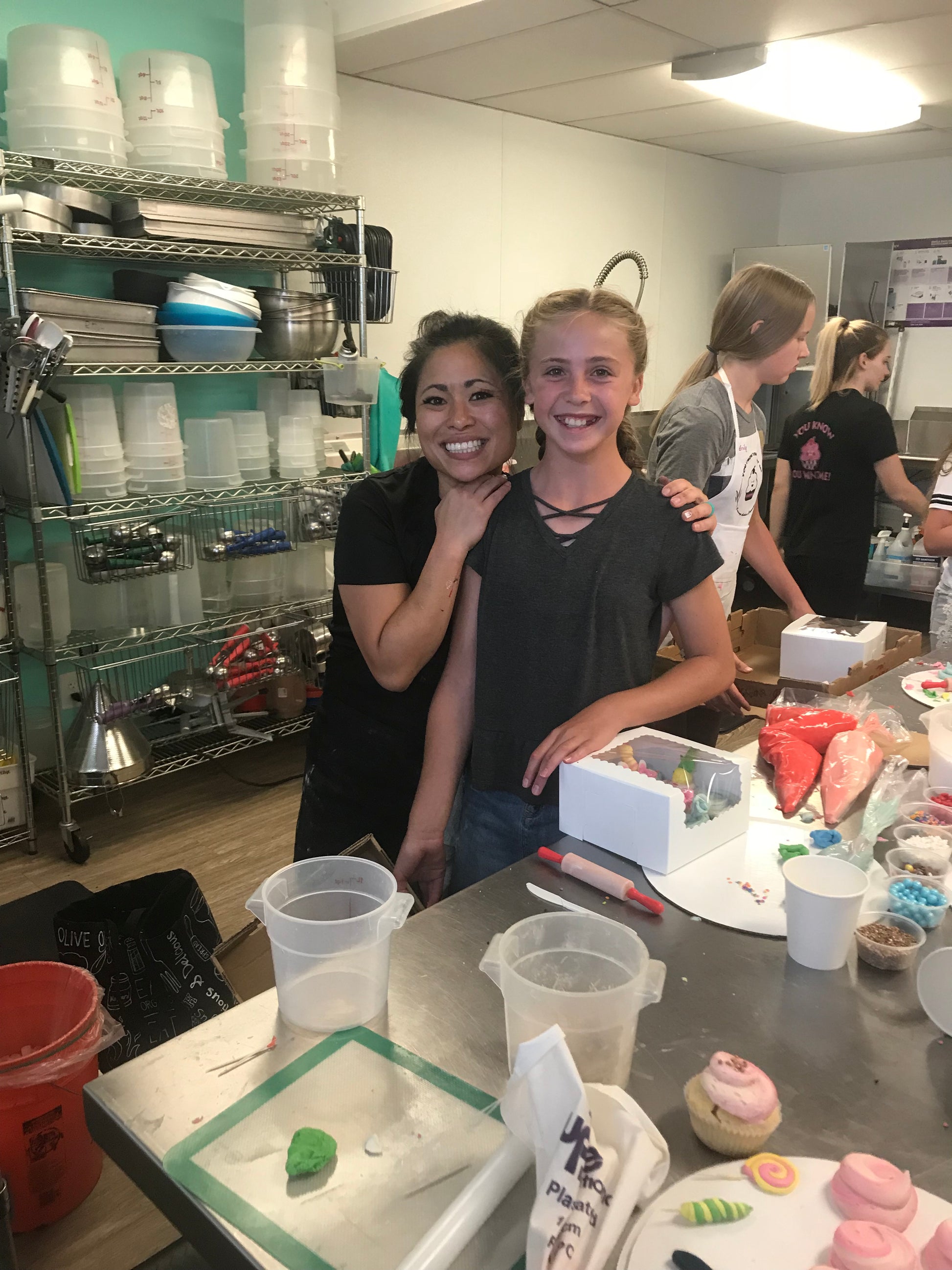 In our beginning class, kids get to spend 4 days learning how to frost sugar cookies, decorate cupcakes, make pretzels, pizza, and cake bites! (Side note: this is a beginning class, so the batter and dough are pre-made by our bakers so that time in the camps can be focused on finishing/decorating the products!) |