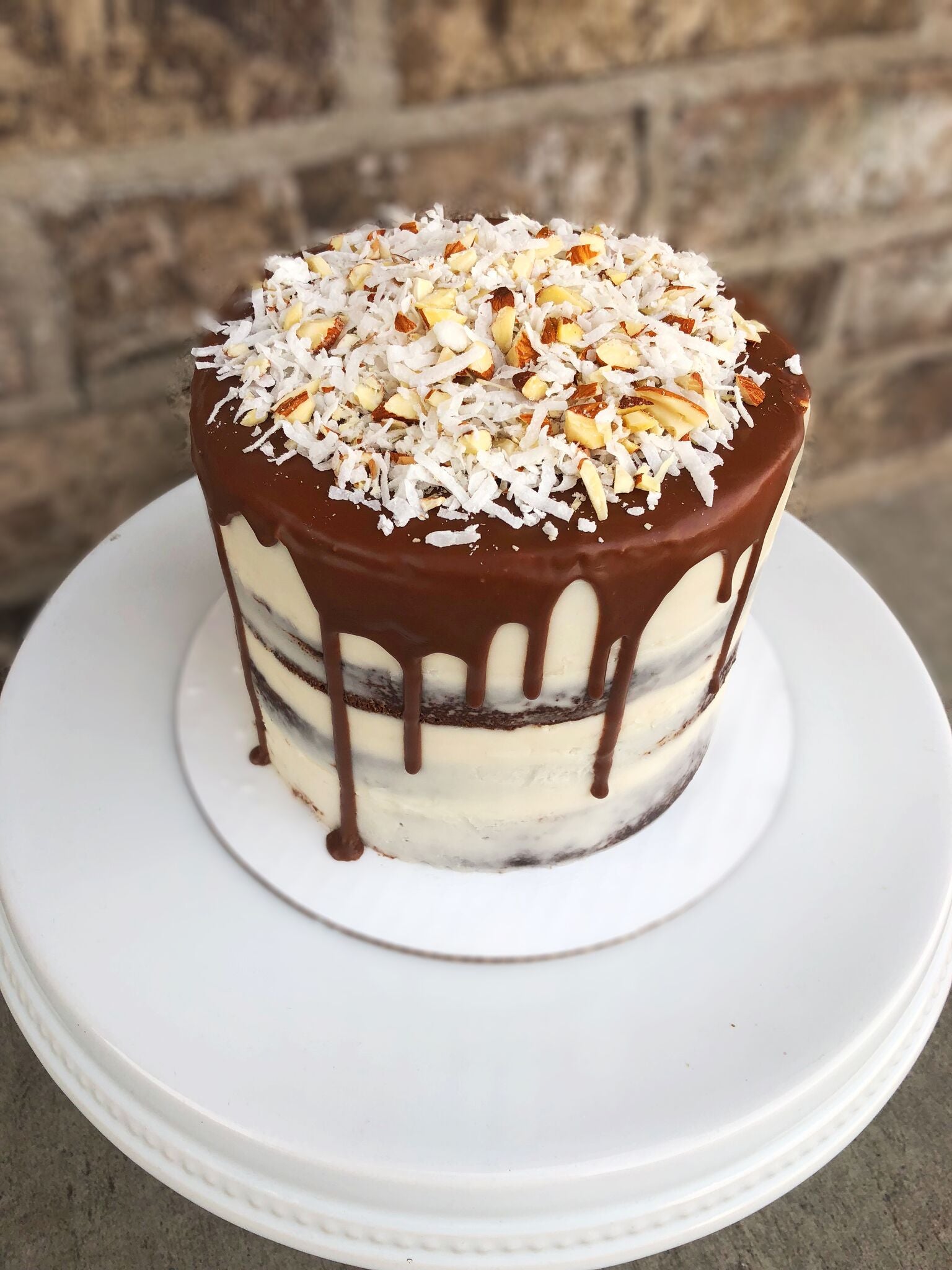 Coconut Cream Cheese Frosting: Powdered Sugar, Mascarpone Cheese, Cream Cheese, Butter, Shredded Coconut Vanilla, Salt, Almonds