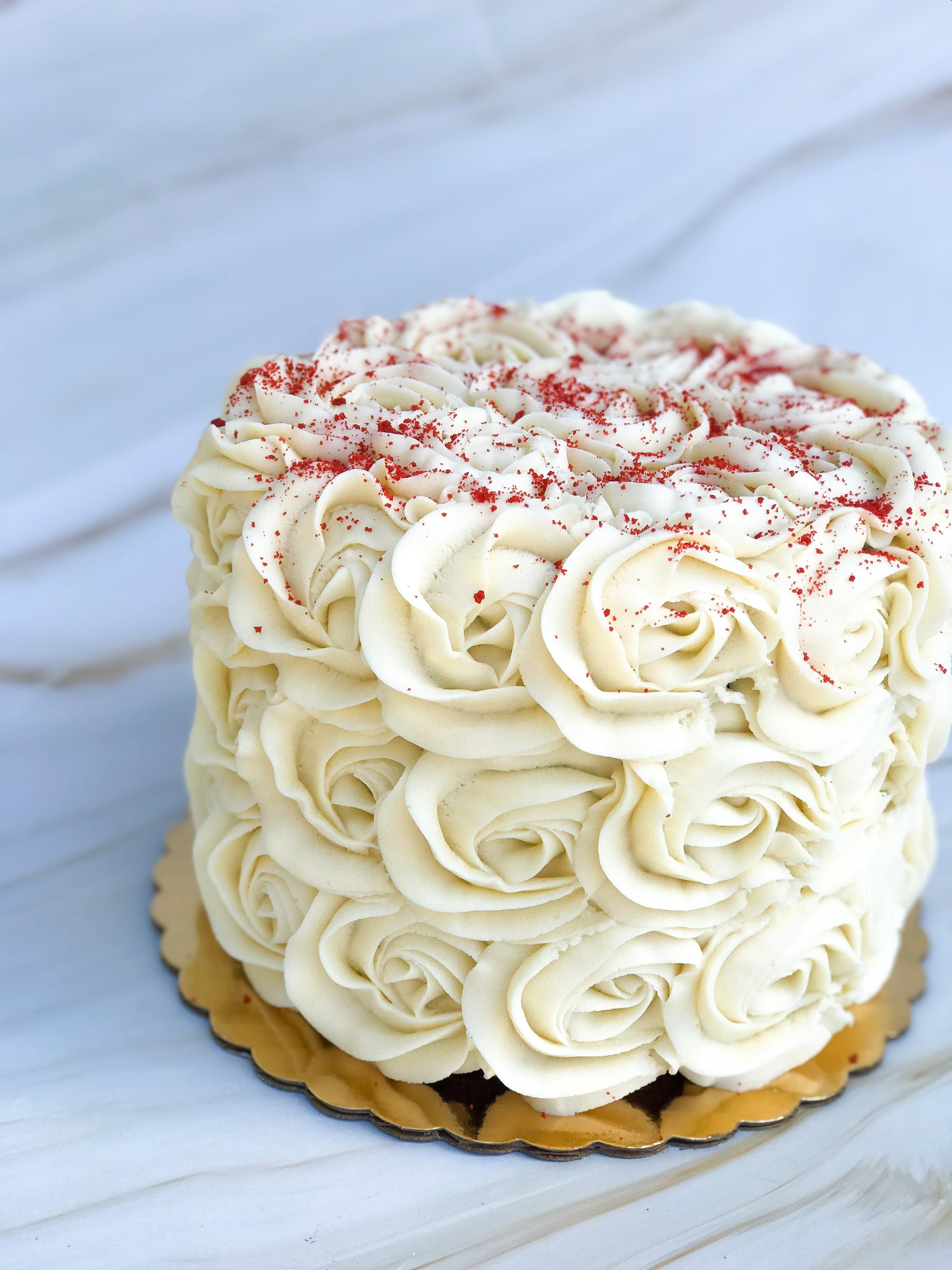 Red Velvet Cake: Sugar, Flour, Buttermilk, Oil, Butter, Eggs, Cornstarch, Cocoa, Vinegar, Vanilla, Baking Soda, Red Food Coloring, Baking Soda, Salt